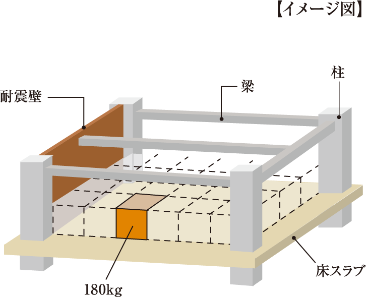 180kg/㎡(1㎡に180kgの荷物を隙間なく置いた状態)の重さにも耐えられる強度の高い床構造。