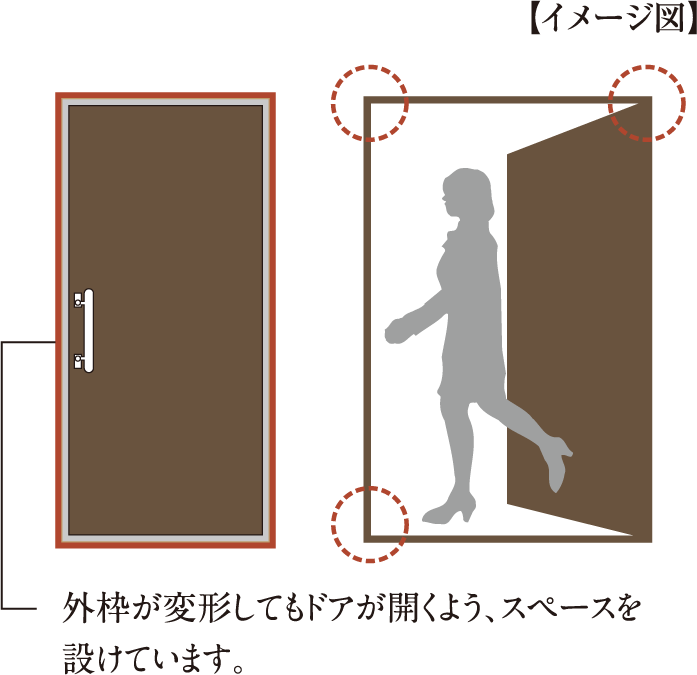 玄関ドアの枠が地震によって変形し開閉できなくなる事態に備えて、耐震枠を導入。ドアと枠の間にスペースが確保され、変形してもドアの開閉が可能です。