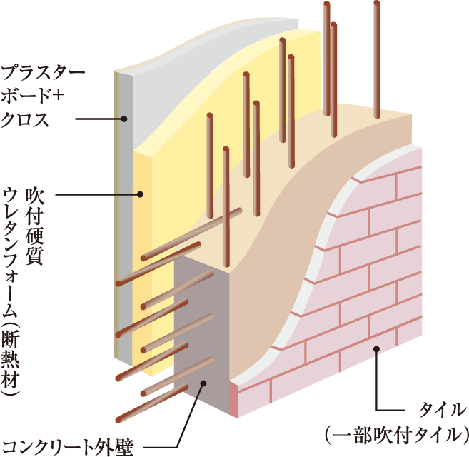 外壁は厚み150㎜のダブルチドリ配筋コンクリート構造で内側に吹付け硬質ウレタンフォーム断熱材30㎜とプラスターボードを採用し、より断熱性・遮音性を高める構造としました。