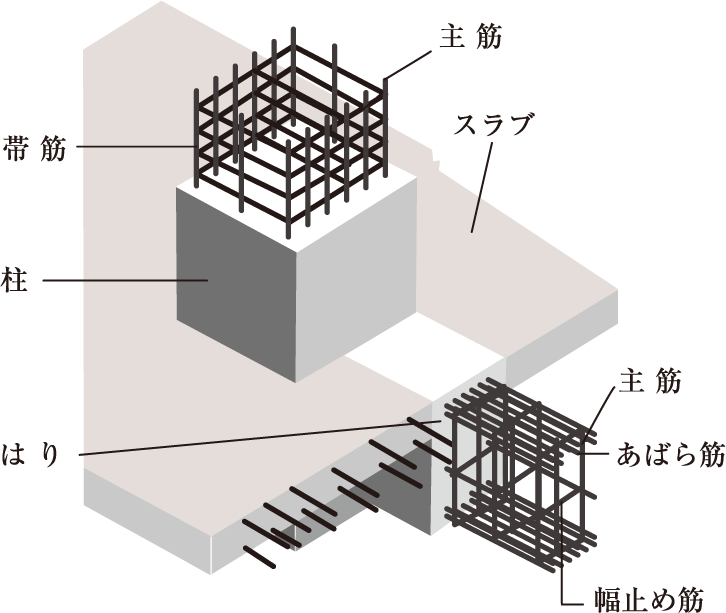 建物の柱主筋を巻く鉄筋(帯筋)には、溶接閉鎖型フープを採用し、柱の粘り強さを高めています。また、主要構造部である基礎柱・梁に24〜33N/m㎡のコンクリートを採用しました。緻密で劣化しにくい耐久性の高いコンクリートです。
