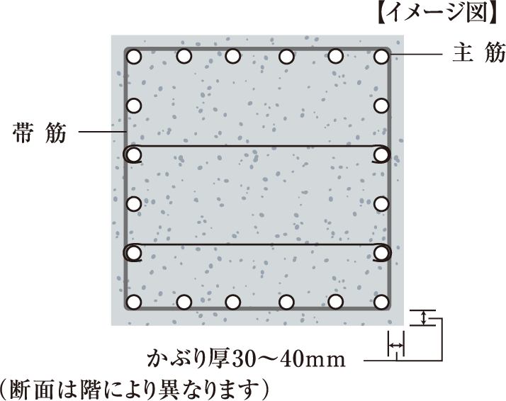 鉄筋は外気や雨に濡れると酸化するのでアルカリ性のコンクリートでしっかりとガードする必要があります。この鉄筋を覆う厚さを“かぶり厚さ”と呼び、法律で[外壁20mm、その他の部位30mm〜40mm]の厚さが義務づけられています。「グランドキャッスル穴生」は、柱・梁・外壁を30mm〜40mmのかぶり厚さで建物を保護しています。