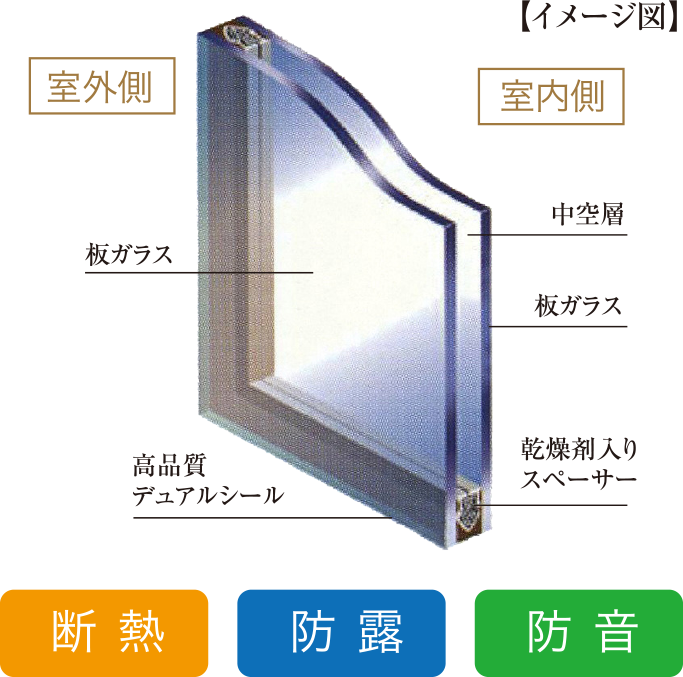 ガラスの間に空気層を挟み、断熱性を高めて結露防止に配慮した複層ガラスを採用。