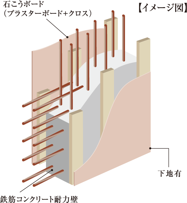 各住戸境の耐力壁は厚み200mmのダブル配筋コンクリート構造となっています。シングル配筋に比べて高い構造強度、並びに耐震性を実現しています。