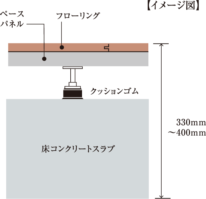 各洋室の床組は、床コンクリートスラブの上にフローリングとベースパネルを置く二重床構造です。ベースパネル受け支柱の足下にあるクッションゴムが振動を吸収します。